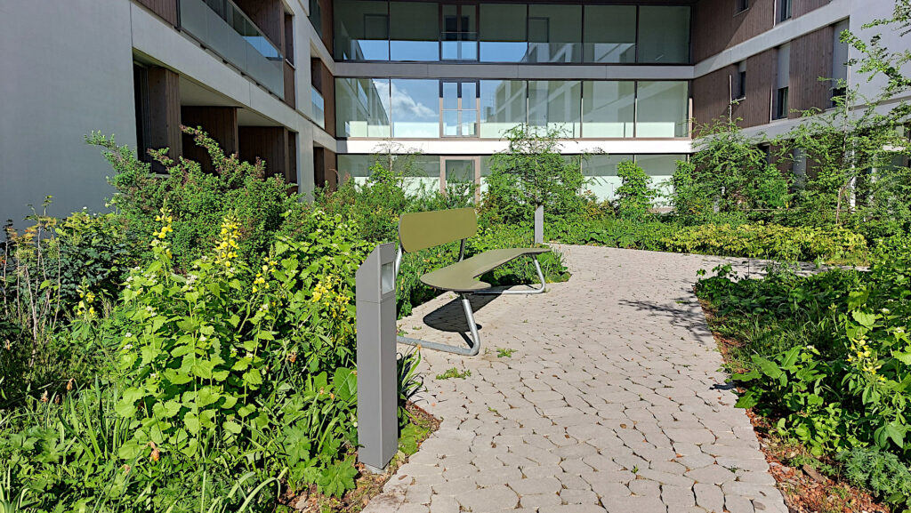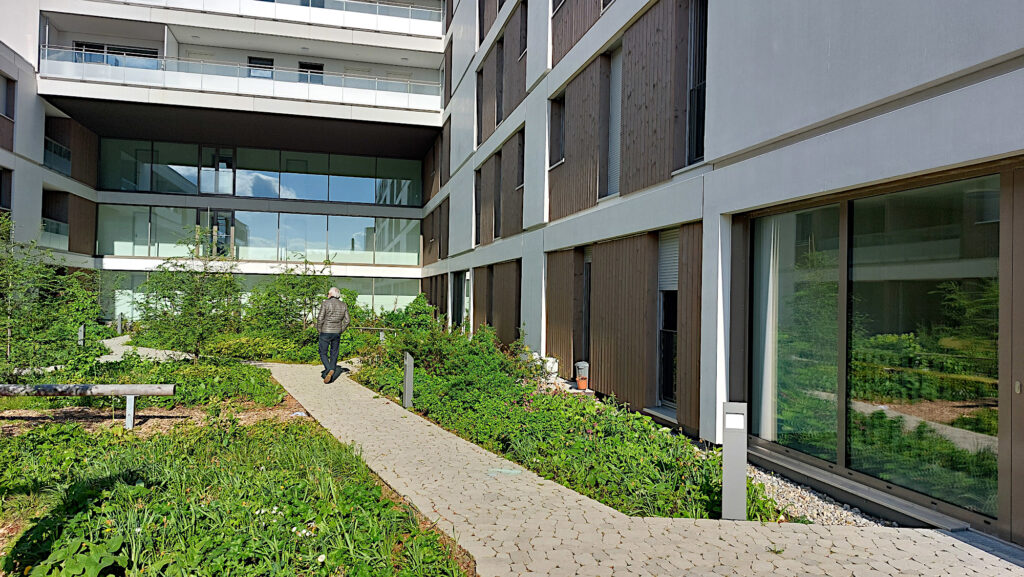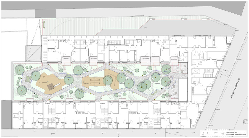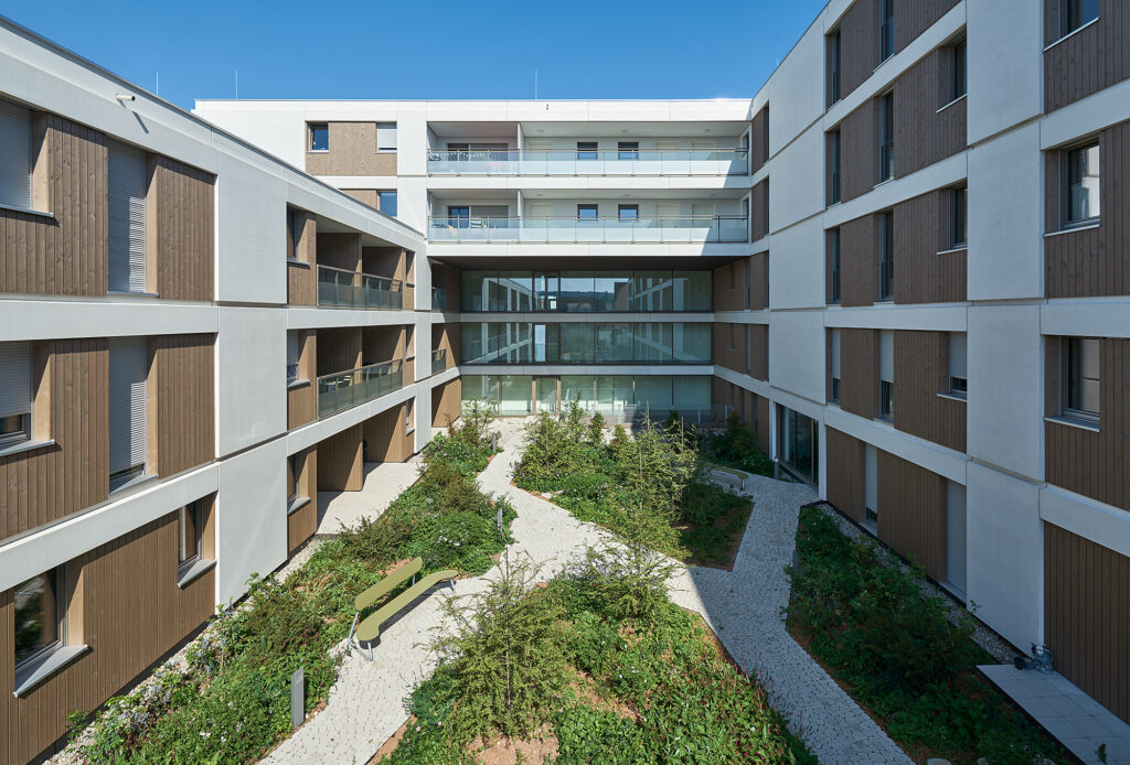 ersten Obergeschoß, über einem Einkaufsmarkt. Der Gartenhof ist eine grüne Oase, ein Spiel- und Aufenthaltsbereich für die Bewohner:innen und Mitarbeiter:innen im innerstädtischen Raum. Leichte Geländemodellierungen strukturieren den Raum. Als Baumschicht fungieren mehrstämmige Scheinbuchen, die Strauchschicht bilden sommer- wie wintergrüne Gehölze. Eine Staudenmischung aus Kultur- und Wildstauden, die „verwildern“ dürfen, verwandelt den Gartenhof in ein artenreiches und naturnahes Refugium. Ein kleiner Naschgarten im südwestlichen Hofabschnitt bereichert zusätzlich den Hof.