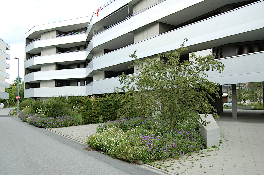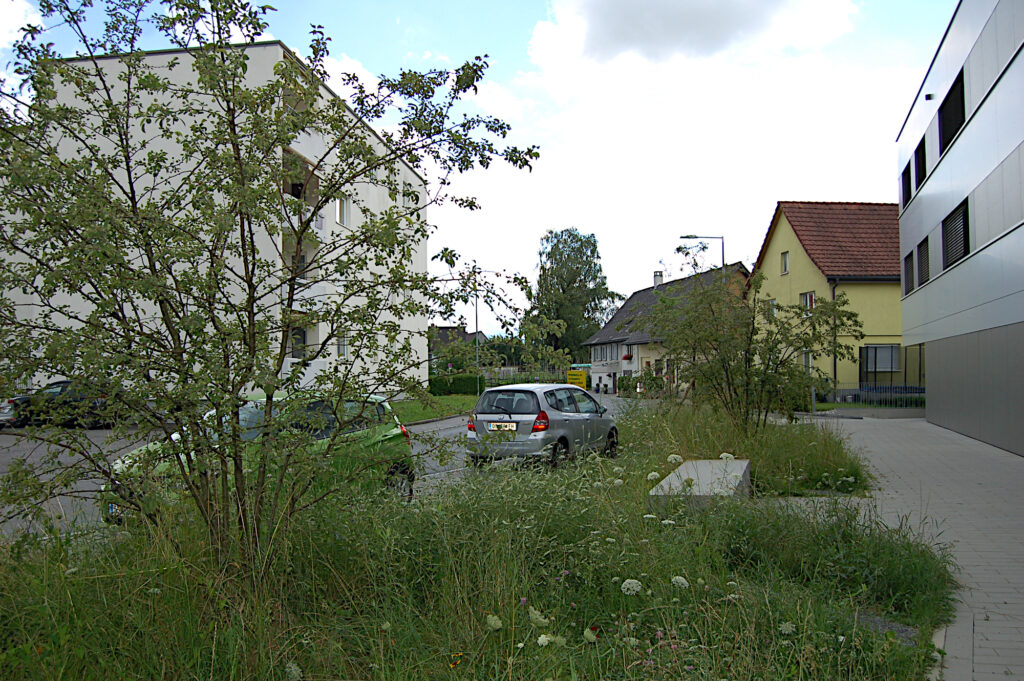 Der Grünraum entlang der Holzstraße begleitet den Erschließungsweg, Hausbänke laden zu informellen Begegnungen ein. Mehrstämmige Zierapfelbäume akzentuieren den Freiraum zur Straße. Der Grünstreifen ist als biodiverser Wiesensaum ausgebildet, in welchen sich Längsparkstreifen einschreiben und mit Kräuterfugen durchgrünt sind. Nach Westen orientieren sich die Privatgärten, die durch Heckenkörper untereinander getrennt sind. Ein mäandrierender Saum aus unterschiedlichen Blütensträuchern und Stauden bildet einen lichten grünen Filter zum öffentlichen Weg, sodass ein Gespräch über die Gartengrenze möglich ist.