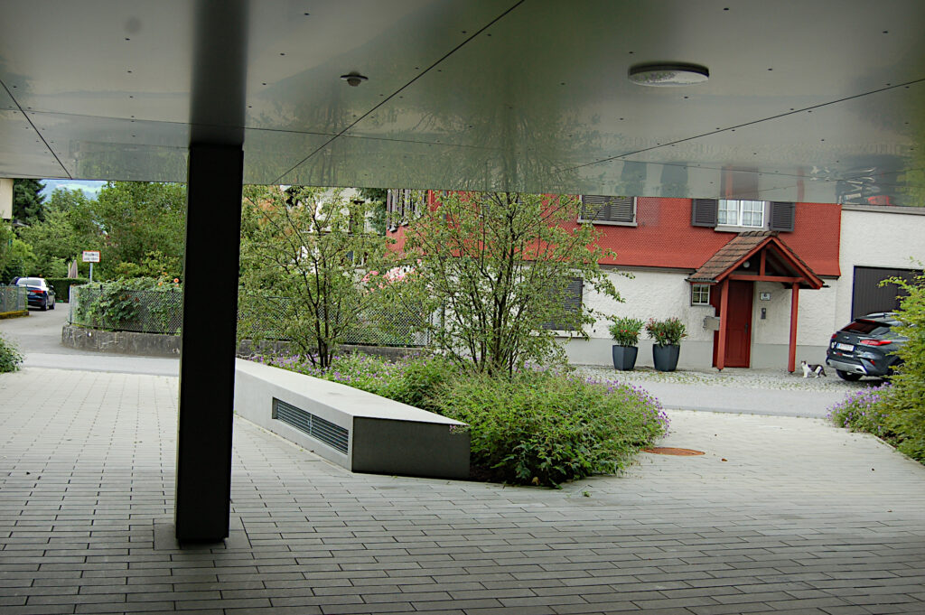Fuß- und Radweg ins Zentrum von Lustenau, eine kleine Baumgruppe akzentuiert den Platz. Das Café orientiert sich auf den Platz der westseitig von Bäumen flankiert ist, der Brunnen setzt hier einen Akzent.