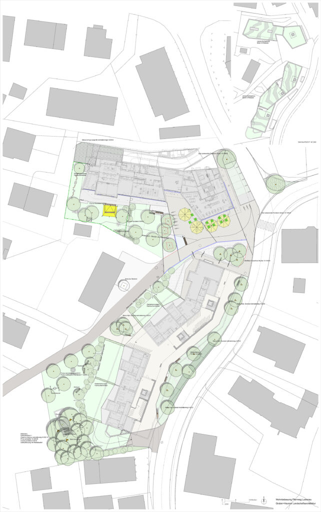 Im Westen, „im Wäldchen“ liegt ein beschatteter Sandbereich, balancieren, schaukeln, hüpfen, … dieser Spielraum ist siedlungsöffentlich, wie öffentlich nutzbar. Die Grenzen zum angrenzenden Permakulturgarten sind fließend. Die Dächer der Wohnbauten, sowie die Abfahrt der Tiefgaragenrampe sind extensiv begrünt.